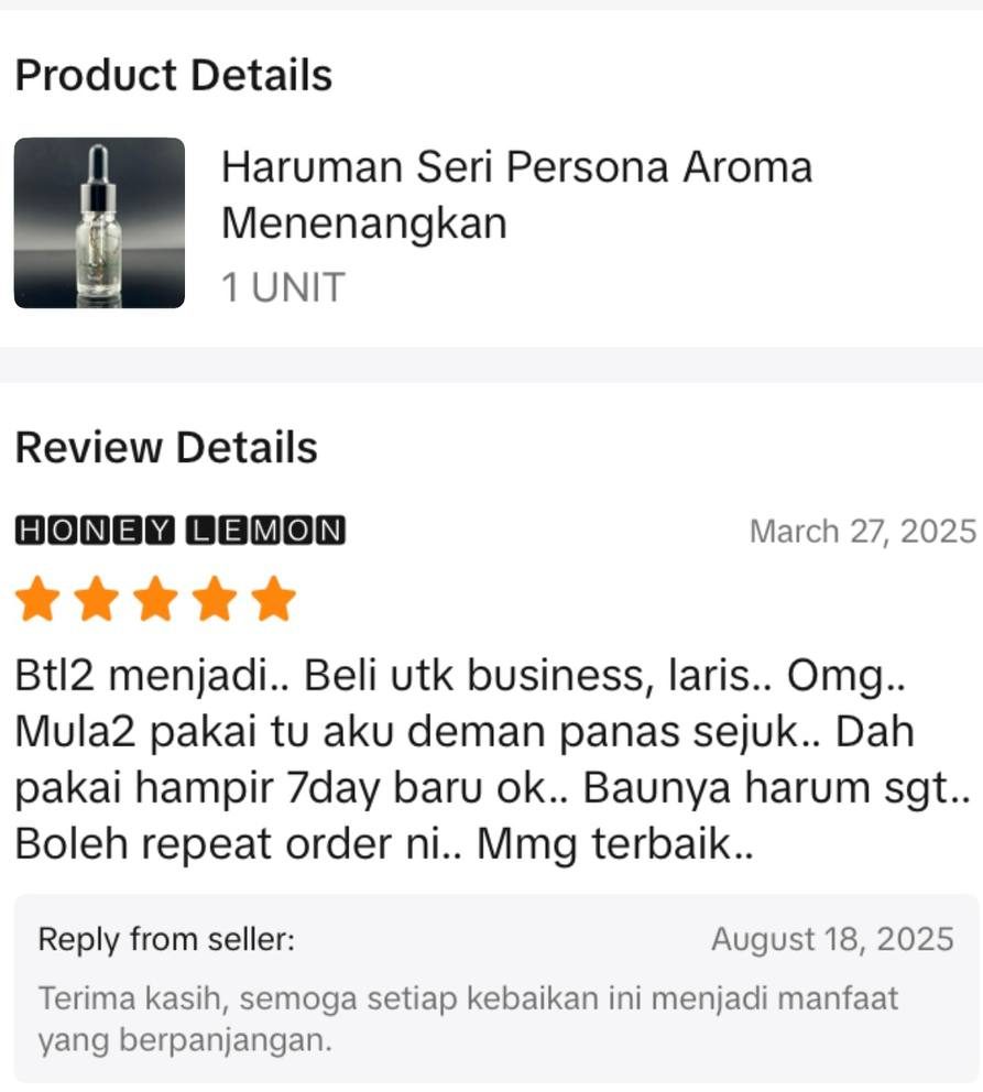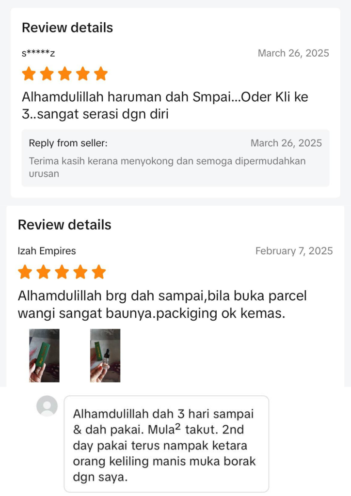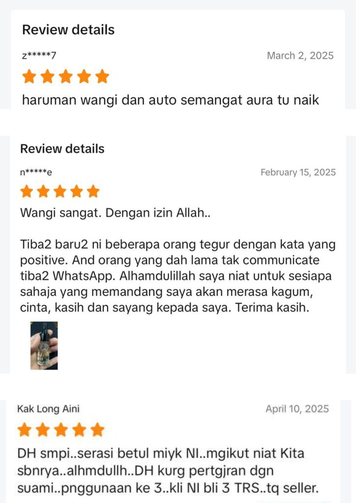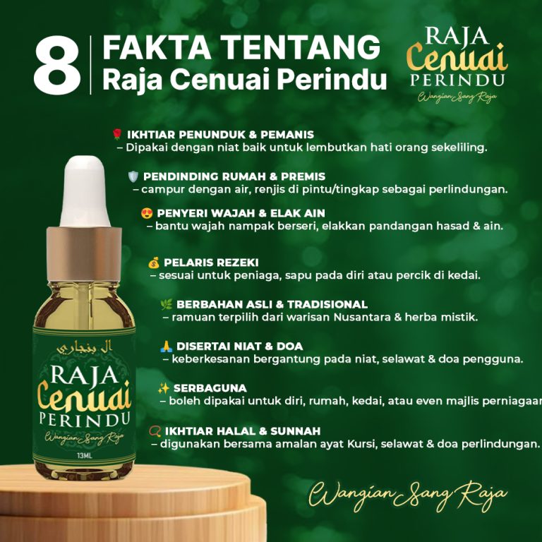 Wangian Raja Cenuai Perindu ini adalah wangian yang dapat membantu anda untuk serlahkan Aura Positif untuk menaikkan karisma diri, kasih sayang serta memudahkan perjalanan perniagaan dan kehidupan anda InsyaAllah.